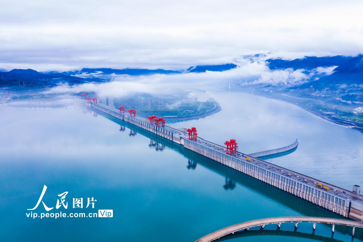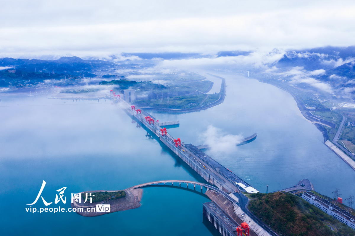 2020年5月8日,细雨中的三峡大坝云飘雾绕。长江水文网实时水情显示,2020年5月8日8时三峡水库水位155.27米,入库流量7400立方米/秒,出库流量12100立方米/秒。
