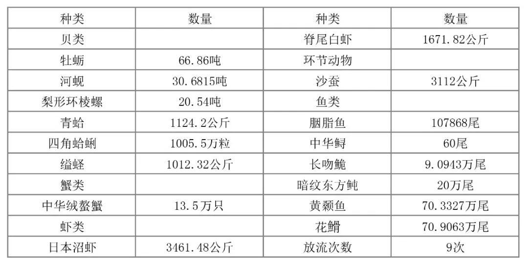 长江口航道管理局强化深水航道建设和维护工绿色增殖放流次数、种群、数量详见右表作生态环境监测,监测范围达到5000平方公里,监测内容包括11项学科,涉及项目包括水、沉积物等15个专题。承担并资助水生生态系统修复工程,开展了不同种类生态修复及渔业资源增殖放流工作。