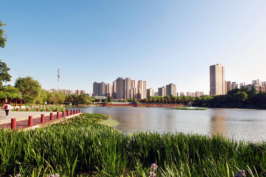 经过水环境治理后,湖水清澈见底,岸边绿树成荫的西洋湖公园
