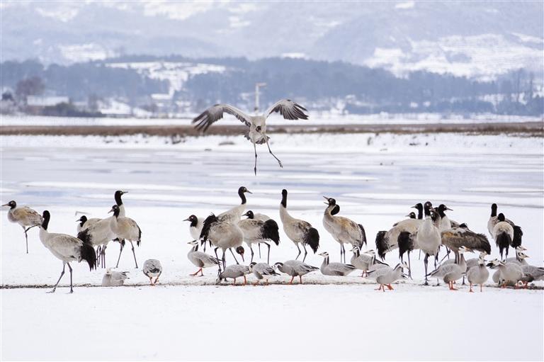 黑颈鹤在威宁草海国家级自然保护区翩翩起舞。何欢 摄