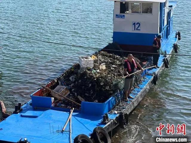 清漂人员清理长江漂浮物。郭晓莹 摄