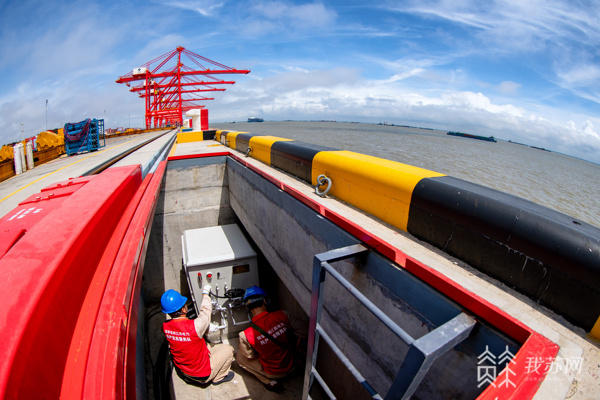 在太仓港四期码头前沿,记者看到一排红色的铁箱,岸电接电箱就位于其下方。太仓港四期码头岸电系统于今年3月开工建设,可为4个泊位靠港船舶供电,最大可满足5万吨级集装箱船舶停靠期间用电需求。