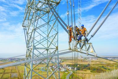 4月13日,白鹤滩—江苏±800千伏特高压直流输电工程(南京段)建设现场,电力施工人员正在架设导线。通讯员 杜懿 摄