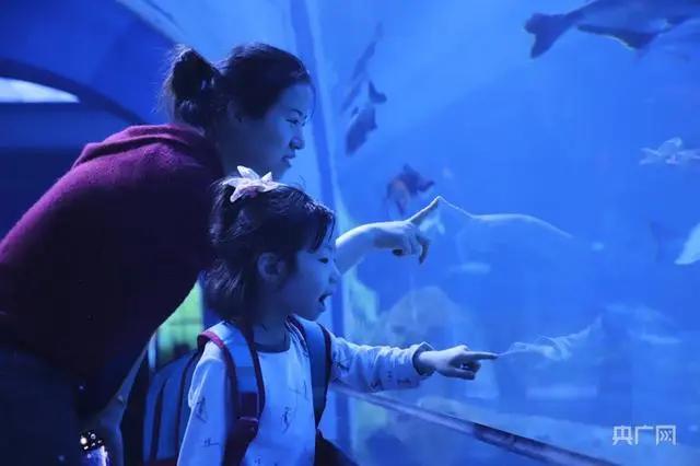 长江鄱阳湖水生生物保护中心内,游客与长江水生生物亲密接触(央广网发 沈海斌 摄)