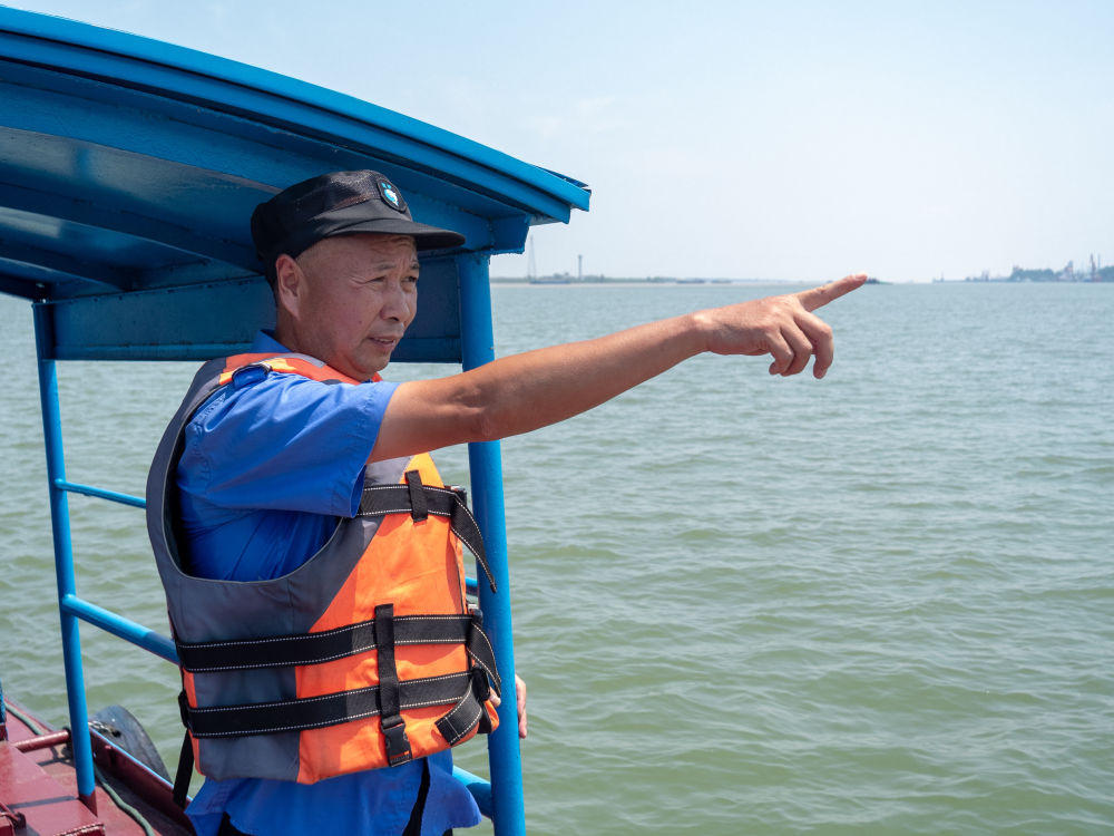 夏日清晨,在长江与鄱阳湖交汇水域,江西省湖口县江豚协助巡护队队员来到水面巡护。