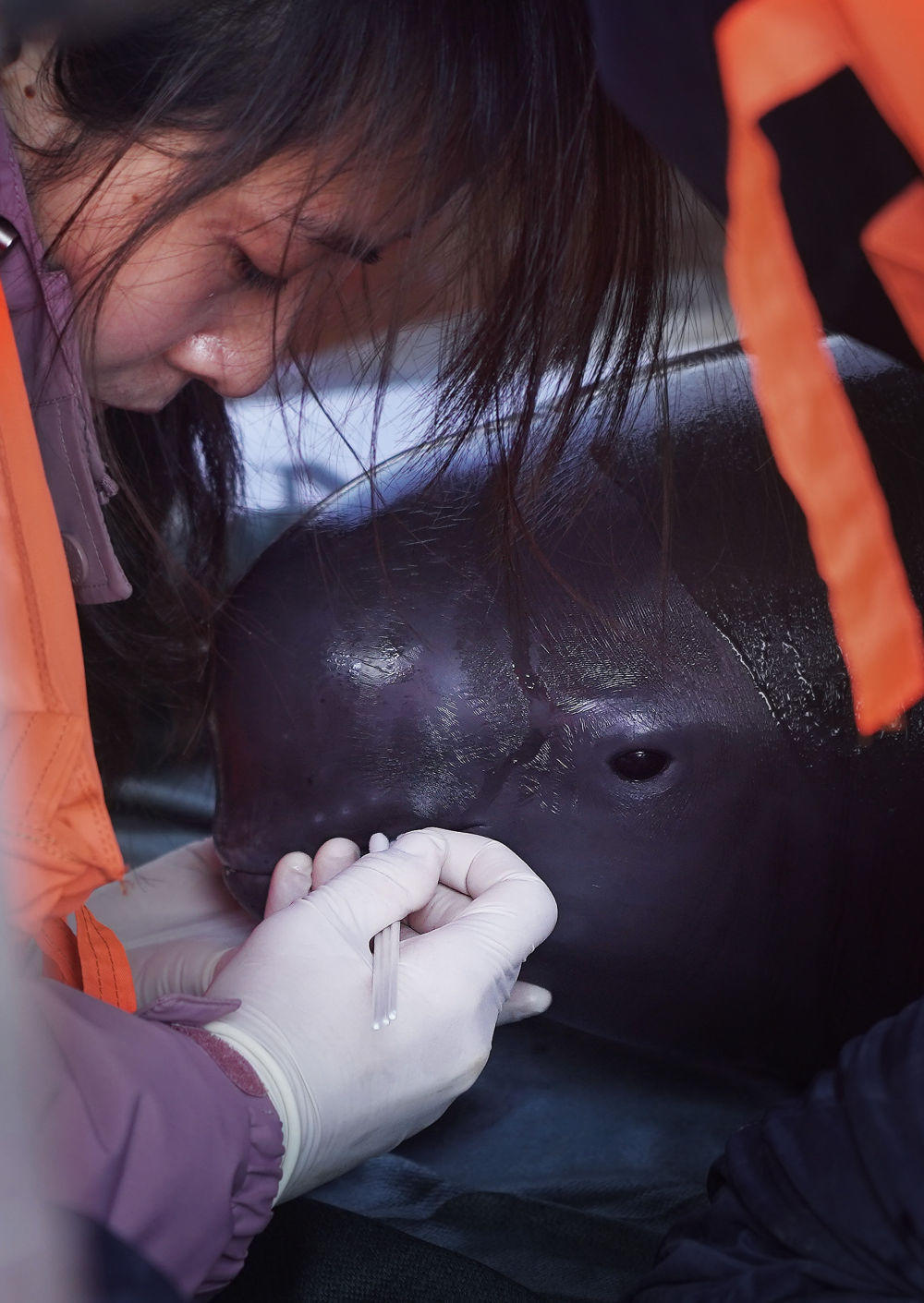 在江西鄱阳湖松门山水域,科研人员在船上为江豚进行体检(2023年2月15日摄)。新华社记者 万象 摄