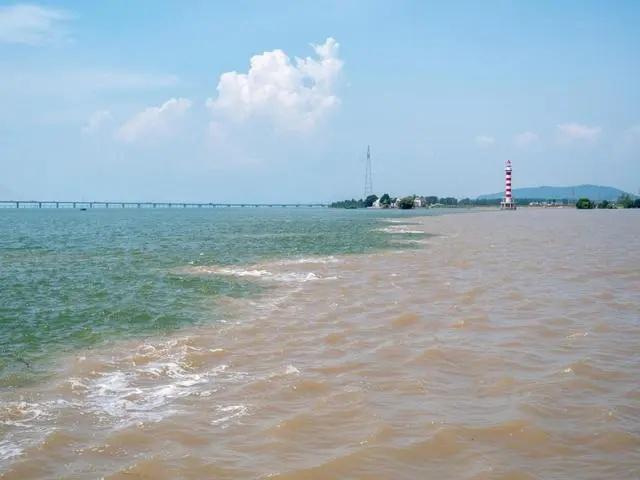 图为7月23日拍摄的长江与鄱阳湖交汇水域的“江湖两色”场景(图右为长江,图左为鄱阳湖)。新华社记者 郭杰文 摄