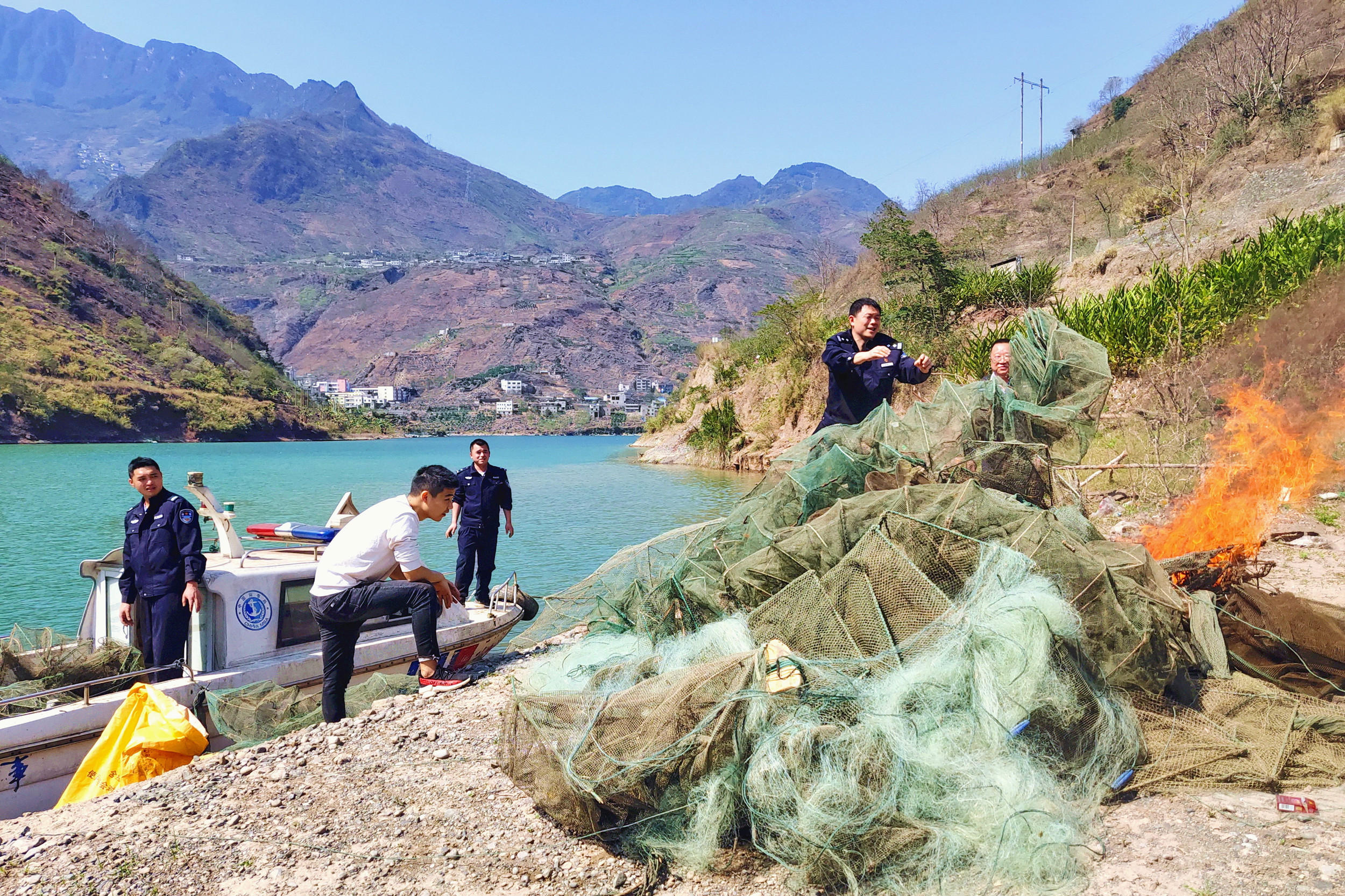 巡逻宣传、收缴拦河网、拆除网箱、拖走捕鱼船只……在碧波荡漾的江面上,水上巡逻执法艇载着永善县公安、渔政、海事等部门组成的水域综合执法队,已连续开展水域专项整治行动10多天。