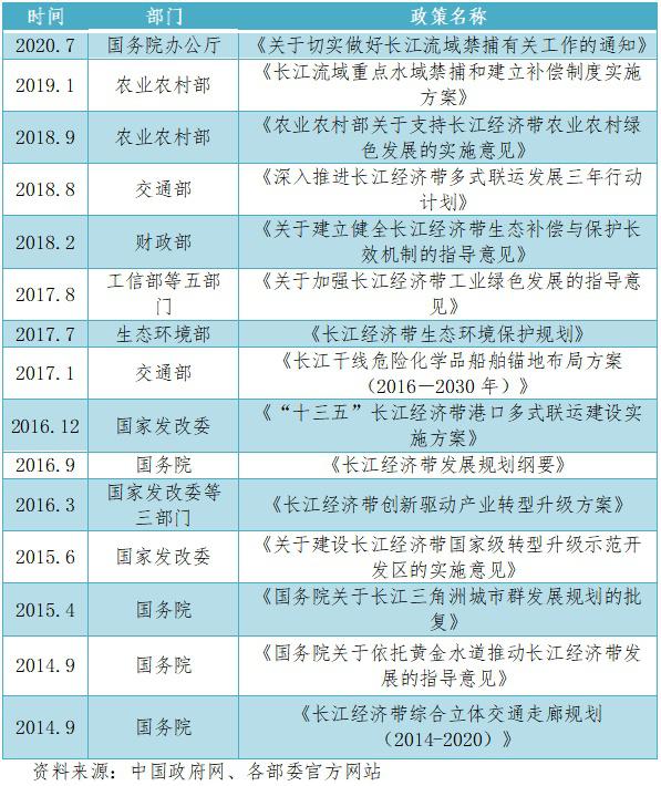 2016年9月,国务院办公厅印发《长江经济带发展规划纲要》,确立了长江经济带“一轴、两翼、三极、多点”的发展新格局,以及未来一段时期的发展目标、重点任务,是推动长江经济带发展的纲领性文件。为加快落实国务院部署,各部委出台一系列针对性的政策措施,有力推动了长江经济带战略实施。生态保护方面,生态环境部、工信部、农业农村部先后出台《长江经济带生态环境保护规划》《关于切实做好长江流域禁捕有关工作的通知》等政策文件,为改善长江经济带生态治理提供政策保障。交通走廊建设方面,先后出台《长江经济带综合立体交通走廊规划》《“十三五”长江经济带港口多式联运建设实施方案》等重要文件,有力推动沿江交通基础设施的建设和发展。产业升级方面,出台《关于建设长江经济带国家级转型升级示范开发区的实施意见》《长江经济带创新驱动产业转型升级方案》《关于加强长江经济带工业绿色发展的指导意见》等政策,加快推动沿江省市产业升级和产业集群发展进程。区域协调和城镇化建设方面,出台《长江中游城市群发展规划》《长江三角洲城市群发展规划》《长江经济带农业农村绿色发展的实施意见》等重要政策,为促进沿江区域协调发展、加快新型城镇化建设注入强大动力。