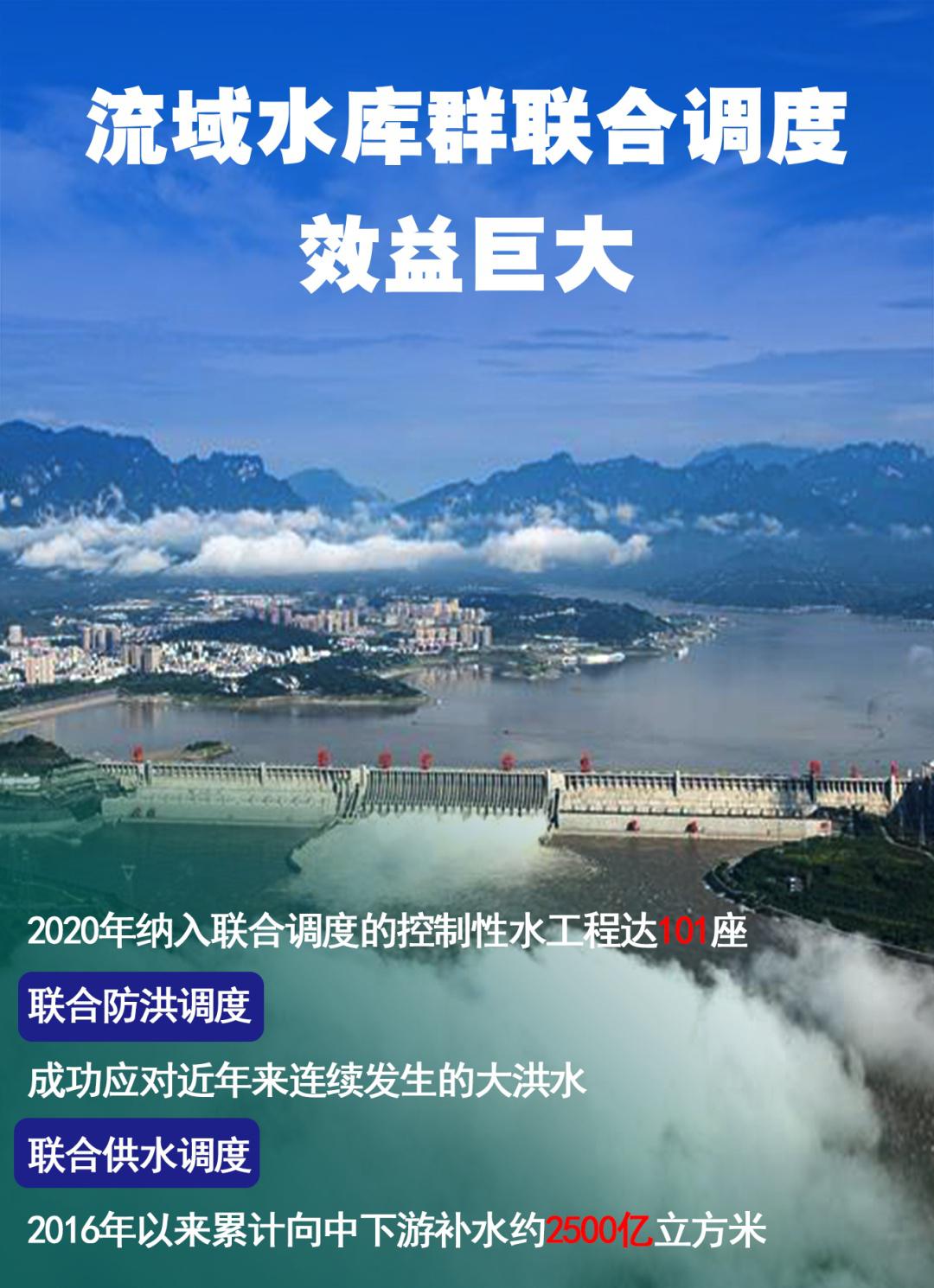 联合防洪调度,成功应对了近年来连续发生的大洪水,包括2016年中下游型大洪水、2017年中游型大洪水、2018年上游型较大洪水以及2020年流域性大洪水。联合供水调度,有效缓解了中下游枯水期供水形势,2016年以来,纳入联合调度的上游控制性水库群累计向中下游补水约2500亿立方米。