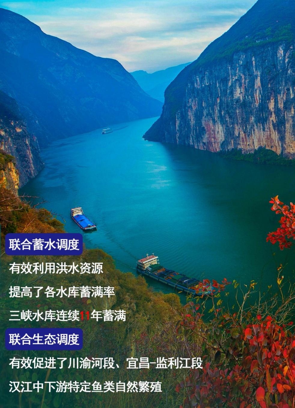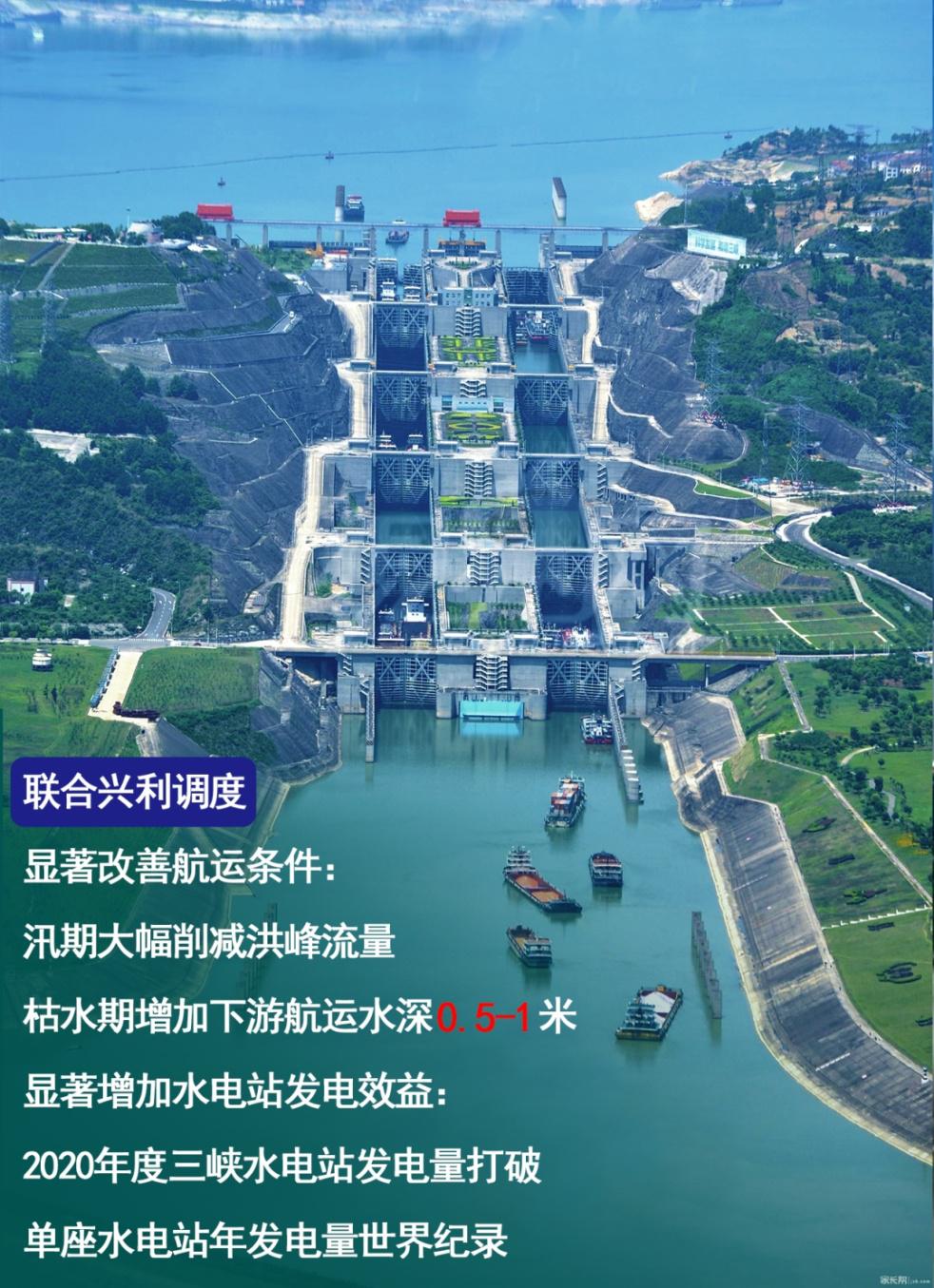 联合蓄水调度,有效利用洪水资源,提高了各水库蓄满率,三峡水库连续11年蓄满。联合生态调度,有效促进了川渝河段、宜昌-监利江段、汉江中下游特定鱼类自然繁殖。联合调度还进一步提升了航运和发电效益,在航运方面,水库群联合调度汛期大幅削减洪峰流量,枯水期增加下游航运水深0.5-1.0米,显著改善了航运条件;在发电方面,在确保防洪安全的前提下充分利用洪水资源,显著增加了水电站发电效益,2020年度三峡水电站发电量打破了单座水电站年发电量世界纪录。