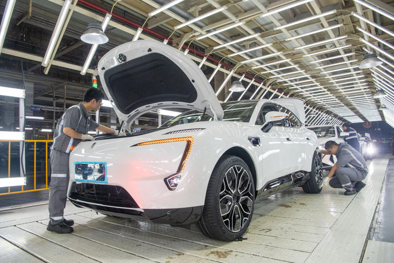 2023年7月20日,在位于重庆市江北区的长安汽车生产基地车间内,工作人员在新能源汽车阿维塔生产线上作业。新华社记者 唐奕 摄