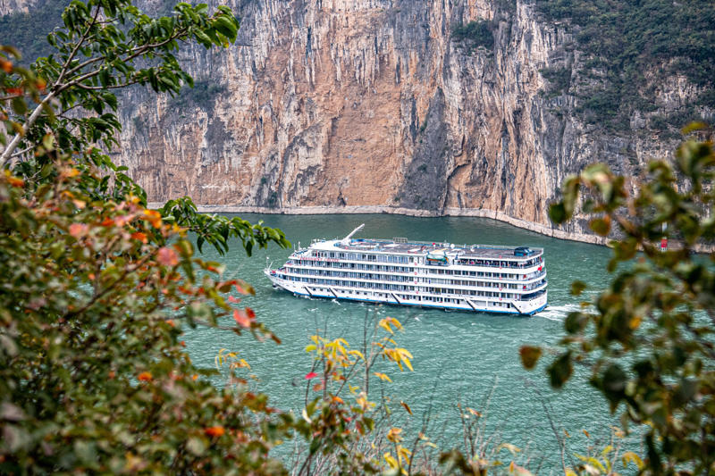 2023年11月29日,一艘游船从重庆市奉节县长江瞿塘峡夔门驶过。新华社记者 唐奕 摄